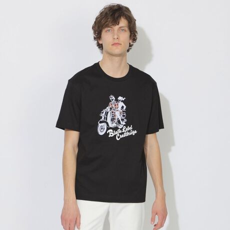 イギリスの1960年代モッズスタイルをモチーフにしたグラフィックをプリント。当時のスタイルとして印象的なスーツスタイルで乗るスクーターのグラフィックにクレストブリッジチェック柄を掛け合わせた遊び心あるデザインです。チェック部分は細かな毛羽感のあるフロッキープリントで表面感ある見映えもポイント。ややゆったりとしたリラックスシルエットで1枚でもサマになる一着です。