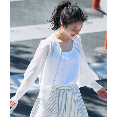 ■デザイン控えめなシアー感が涼しげな、MA-1型ジップアップニットブルゾンです。ニットならではの優しくコンパクトな目面で繊細に編まれており、カジュアルすぎず高級感ある佇まいに。表面の微光沢感もプラスされ、ICBらしくクリーンでモードな印象。どんなスタイリングにも気軽にさらっと羽織っていただける様、ボトムを選ばないレングスやサイズ感に仕立てています。裾や袖はRIB編みでシルエットにコントラストをプラスしました。メタルジップや3本針ステッチのさりげないディティールも拘りポイントです。