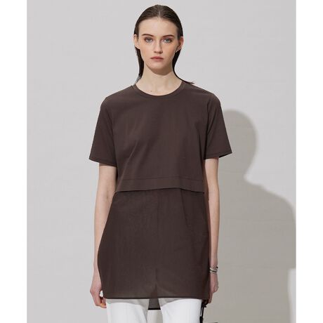 ■デザイン程よくゆとりのある半袖プルオーバーに透け感のある別素材をドッキングさせたデザイントップスです。高めの切り替え位置と、シアー素材との切り替えが新鮮で1枚着はもちろん、羽織やニットとのレイヤードでも使える汎用性高い1枚です。