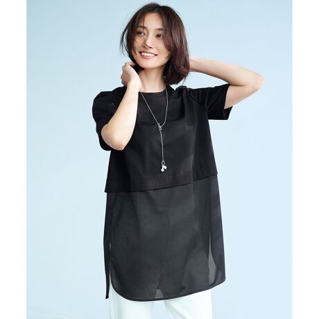 ■デザイン程よくゆとりのある半袖プルオーバーに透け感のある別素材をドッキングさせたデザイントップスです。高めの切り替え位置と、シアー素材との切り替えが新鮮で1枚着はもちろん、羽織やニットとのレイヤードでも使える汎用性高い1枚です。