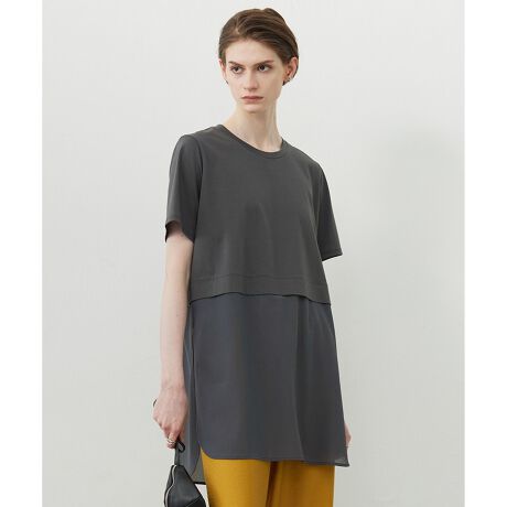 ■デザイン程よくゆとりのある半袖プルオーバーに透け感のある別素材をドッキングさせたデザイントップスです。高めの切り替え位置と、シアー素材との切り替えが新鮮で1枚着はもちろん、羽織やニットとのレイヤードでも使える汎用性高い1枚です。