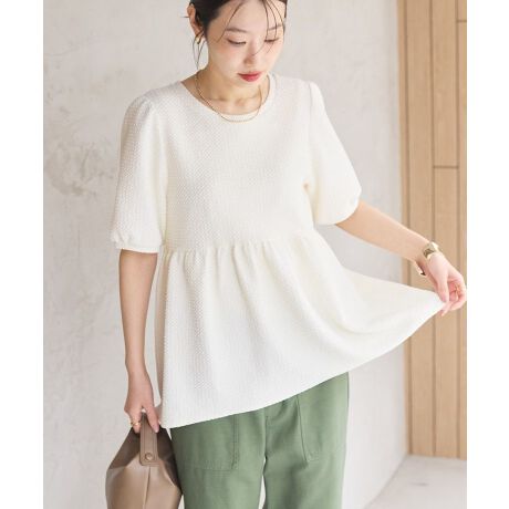 ポコポコとした表情感が華やかなふくれジャガードプルオーバー。ふわっと広がるペプラムシルエットにパフスリーブをデザインしたフェミニンな印象の1着です。ストレッチの効いたコットンベースの素材で、ストレスフリーな着心地を実現。スリムなパンツと合わせることでコーディネイトがすっきりまとまる今季おすすめのアイテムです。透け感[なし]