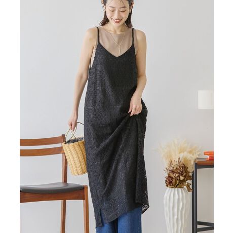 モチーフ柄の総レースが美しいフェミニンなキャミソールワンピース。細いストラップにストンと流れるナローシルエットがより印象的に魅せてくれる一着です。バックリボンでアクセントを付けたアーチラインが後ろ姿も魅力的に演出。レイヤードはもちろん、ルーズなデニムジャケットを合わせたこなれ感あるスタイリングもおすすめです。透け感[ややあり]