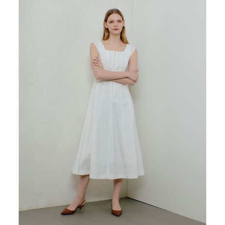 特徴のある袖の雰囲気と、フロントファスナーや切り替えの縦のラインが、クールなトレンド感を表現し、スクエアの胸元の開きが女性らしい印象を演出してくれます。