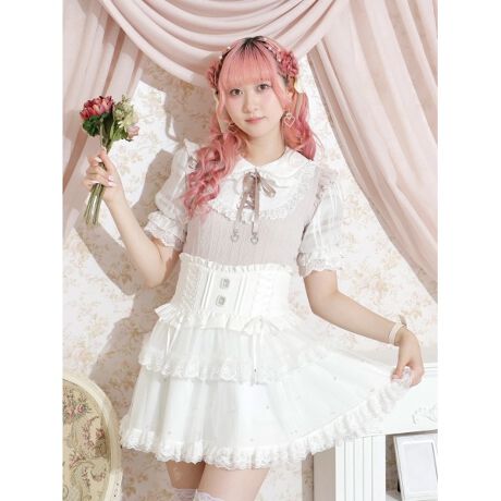 フリルとパールビースをあしらった丸襟デザインでガーリーなムードを演出します。