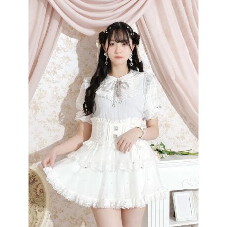 フリルとパールビースをあしらった丸襟デザインでガーリーなムードを演出します。