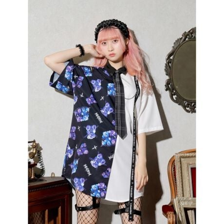 ヤミクマの総柄プリントを組み合わせアシンメトリーなクレイジーシャツ。