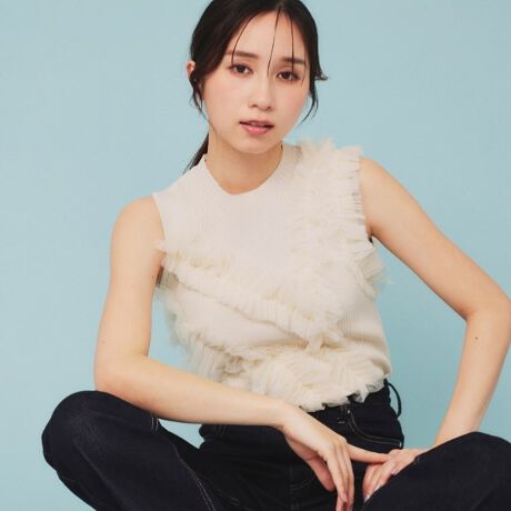 ふんだんにあしらわれたランダムチュールフリルが華やかでスタイリッシュなノースリブニット