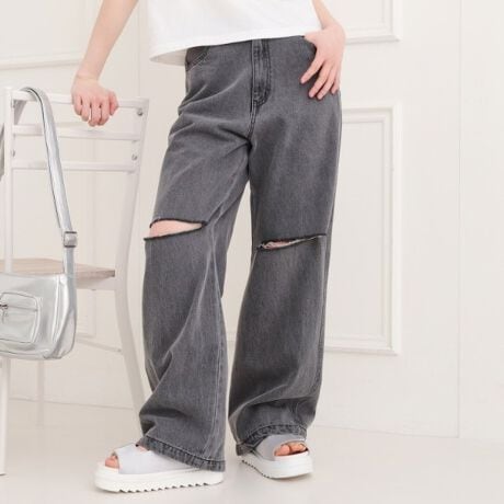 膝にダメージスリットが施されたデニムパンツで、程よいヘルシーな肌見せが叶う1本です。