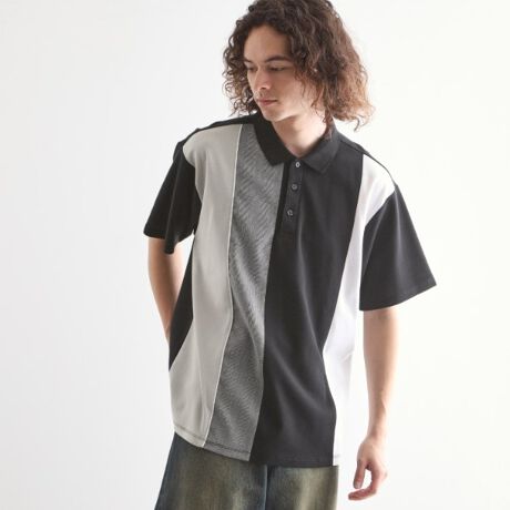 アシンメトリーの切替デザインがアクセントになったポロシャツ。