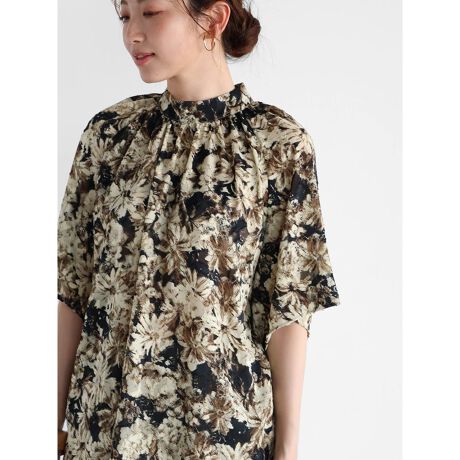 ペイントタッチのフラワーモチーフが目を惹く上品な雰囲気のブラウス。