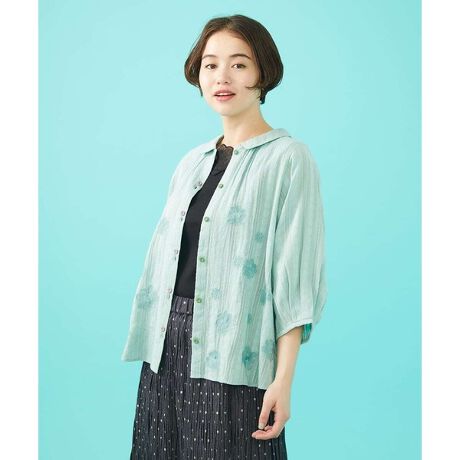 フラットカラーが大人かわいいブラウス。様々なボトムスに合わせやすい丈感で、袖や裾口に丸みのあるシルエットです。胸元から裾にかけてお花の刺繍を施したデザインに、配色の飾りボタンでホコモモラらしい雰囲気をプラスしました。肘まですっぽりと隠れる半端袖タイプ。小さめな襟で普段に使いやすく羽織りとしてもお使いいただけるブラウスは、寒暖差が気になる時期にも活躍間違いなしです。