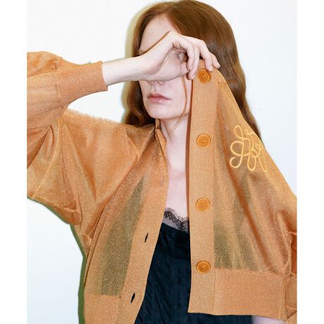 大きなクリアボタンが特徴的なシアーニットカーディガン。
