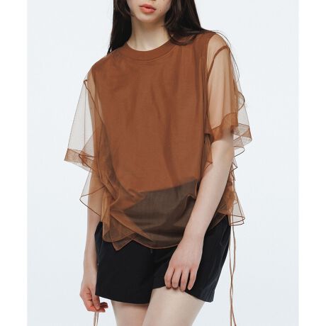 カットソーにシアー感のあるチュールを重ねた、掛け合わせのデザインが魅力のデザインTシャツ。