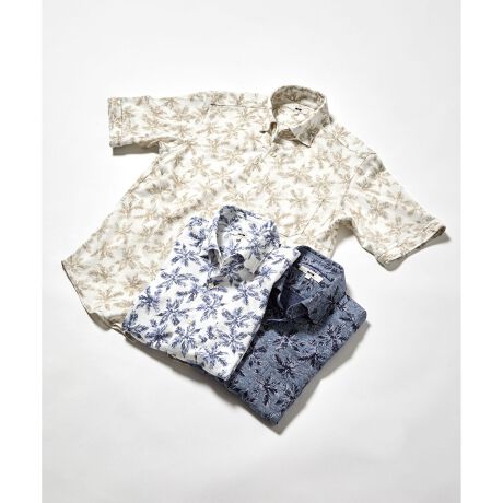 ■デザインリネン混ならではの風合いの生地にのかすれ感のあるリーフ柄モチーフをプリント。リゾート感のあるジャージシャツに仕上げました。アウターシャツとしてカジュアルな着こなしにも、ジャケットインにもお薦めのアイテムです。
