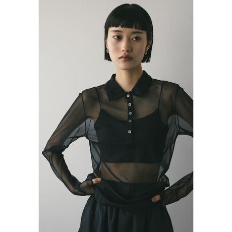 [型番:500IST30-3031]モデル身長166cm(FREEサイズ着用)細かく華奢な編み柄のチュール生地を使用したポロトップ。シアーな表情がさまざまなスタイリングのアクセントになる一枚です。一枚でインナーを着用していただいても、上からニットなどを重ねてもコーディネートのアクセントになる着回しの効くアイテムです。ストレッチあり、透け感あり。【お手入れ方法】手洗い可