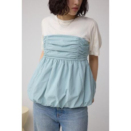 ■ペプラムバルーントップス■ポイントAZULで定番の布帛ドッキングトップスが今年らしくアップデート。トレンドのバルーンを裾に施したトップスです。■ディティール柔らかくて着やすいカットソーに、裾にバルーンを施したビスチェ風の布帛がポイントのトップスです。カジュアルからきれい目、モードまで、着回しの効くデザイントップスです。■スタイリングヒップが隠れる着丈設定で、細身からワイドまで様々なボトムスと相性抜群です。■生地程よい厚みの天竺と、マットな軽い布帛のドッキングです。布帛部分にシワが目立つことがありますが、生地の特性です。布帛と天竺の結合部分が過度な力がかかると生地は破損しますので着用時などご注意ください。透け感:なし裏 地:布帛部分にあり伸縮性:なし光沢感:なし[注意事項]※画像の商品はサンプルです。実際の商品と仕様、加工が若干異なる場合があります。※画像の商品は光の照射や角度、お使いのモニター環境により、実物と色味が異なる場合がございます。※着用、お取り扱いの際は、アテンションタグをご確認ください。
