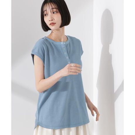 リラックス感ある大人なカジュアルスタイルが完成するワッフル生地のカットトップス。リングボタンがポイントになるヘンリーネックで、ボタンの開閉で抜け感や着こなしの変化を楽しめるアイテムです。