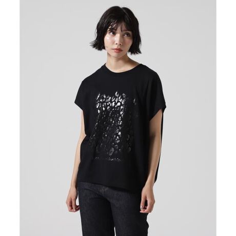 プリントはパキっとした半ラバープリントに透明色の箔プリントを重ね、ぷっくりとキャッチーな風合いに仕上げたレオパード柄です。毛羽感が少ないながらも綿本来のソフトでふっくらとした