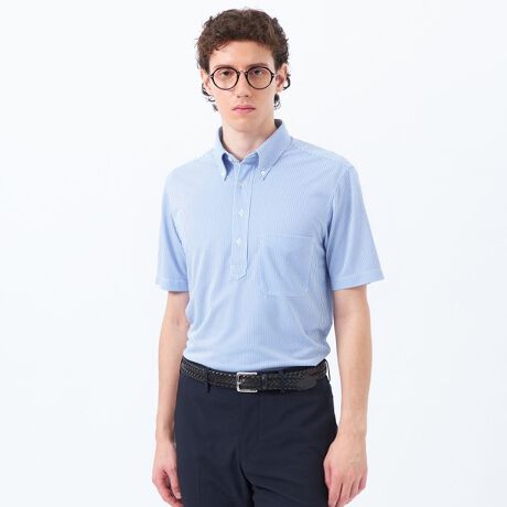 クールビズにピッタリの台衿付きドレスポロ。衿先の自然なロール感をきれいに出し、着用時の立体感が首回りをすっきり見せてくれます。スクエアカットの裾デザインで、スラックスから綿パンツ合わせなどパンツアウトスタイルでも上品な雰囲気で着用いただけます。後襟ぐり、脇下部分には消臭機能のあるテープを縫い込んでおり、気になる臭いを抑えてくれます。また、イージーケア性にも優れており、洗濯後もシワになりにくい素材を使用しています。