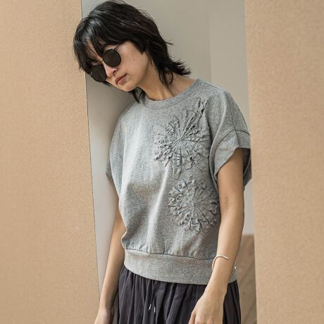 立体的なフラワーモチーフを、カジュアルなTシャツ地で表現した、心浮き立つ一枚。