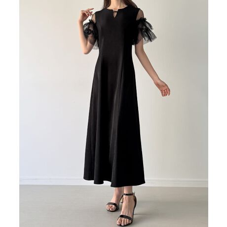 チュールフリル半袖セミフレアワンピース(薄手、裏地なし)