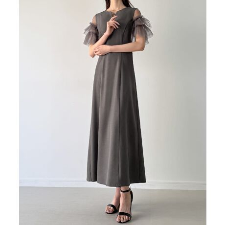 チュールフリル半袖セミフレアワンピース(薄手、裏地なし)