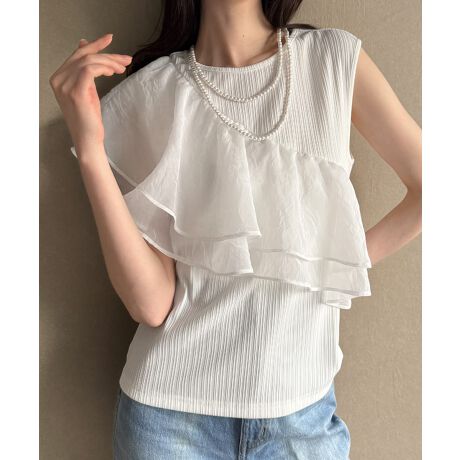 カットソーなので脱ぎ着がしやすく、洗ったあともアイロンの必要がないというところが扱いやすい点です。黒なのですが斜めについたフリルが透けて揺れる素材なので、重たく見えなくて良いです。