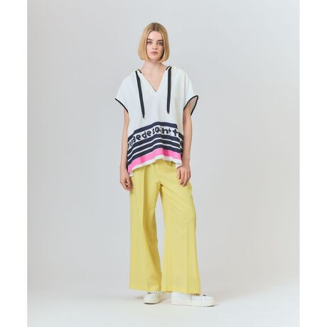 【Japan Fabric】 高級感あるコットン100%のミニループパイルを使用したポンチョフーディ。 大胆なボーダーと手描き風のレタードが日差しに映える一枚です。密度が濃く毛足の短いパイルに、あえて顔料を染みこませてしっかり染め、色鮮やかで夏らしいデザインに仕上げました。ゆったりとした身幅に大きなフードを添えて、リラックスした楽なシルエットに。水着の上からさっと纏うのはもちろん、いつものパンツやデニム、ロングスカート等あえてタウンユースに着て頂いても様になるアイテムです。