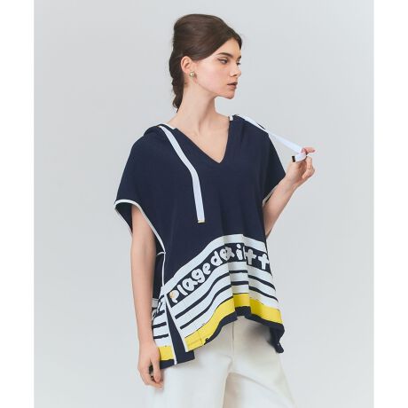 【Japan Fabric】 高級感あるコットン100%のミニループパイルを使用したポンチョフーディ。 大胆なボーダーと手描き風のレタードが日差しに映える一枚です。密度が濃く毛足の短いパイルに、あえて顔料を染みこませてしっかり染め、色鮮やかで夏らしいデザインに仕上げました。ゆったりとした身幅に大きなフードを添えて、リラックスした楽なシルエットに。水着の上からさっと纏うのはもちろん、いつものパンツやデニム、ロングスカート等あえてタウンユースに着て頂いても様になるアイテムです。