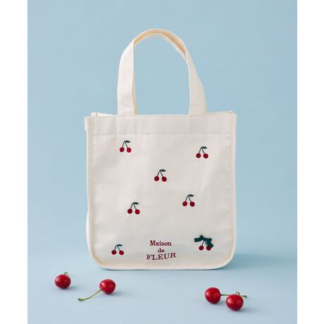 上品なサテン生地に刺繍でチェリーを表現したスクエアトートバッグ。