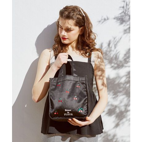 上品なサテン生地に刺繍でチェリーを表現したスクエアトートバッグ。
