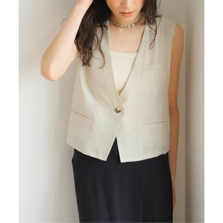 初夏には前ボタンを閉めてノースリーブも女性らしい着こなしに。