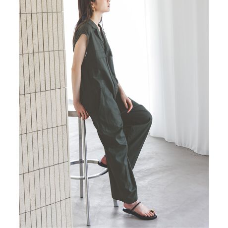 テーラーカラーとフラップポケットにIラインのシルエットが組み合わさった大人に向けたオールインワン。