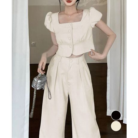 半袖のスクエアネックトップスとタック入りのロングパンツがセットになった、おしゃれな上下2点セットアップ
