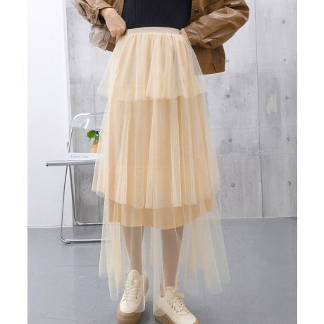 軽やかなチュール素材がエアリーなシルエットを演出するティアードスカート