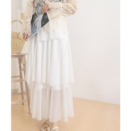 軽やかなチュール素材がエアリーなシルエットを演出するティアードスカート