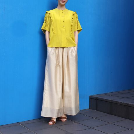 [型番:153405]テンセル混のセミシアー素材でワイドパンツをつくりました。上品なほんのりとした透け感が女性らしさをひきたてます。オフィスカジュアルにも大活躍です。程よい光沢感が華やかなパーティーシーンにも◎ウエストはリブカットソーなので、着脱も楽ちん。春らしいカラーもオススメ!※商品画像は光の当たり具合などにより実際の色味と異なって見える場合があります。※モデル身長164cm