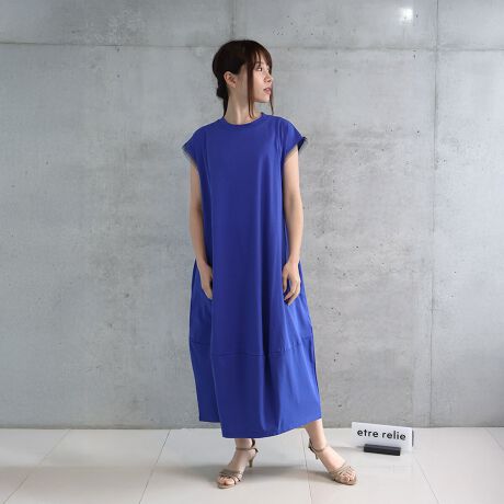 シンプルなカットソーワンピースは裾の切り替えでほんのりコクーンシルエットで体型カバーも叶う大人の抜け感。