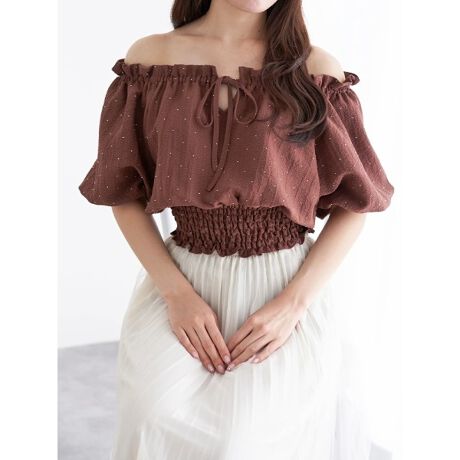 [型番:25560745680]ジョーゼットにビジューのような輝きを散りばめたオフショルブラウス。ネックラインのフリルやぽわんとしたボリュームのある袖も、愛らしい表情を演出してくれます。裾シャーリングを施したショート丈で、メリハリのある美スタイルをメイク。上品な華やかさのあるデザインが魅力のアイテムです。モデル(白/茶/アイボリー着用) 身長:164cm Mサイズ着用