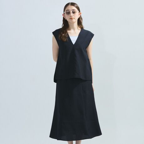 麻のようなドライなタッチ感のテキスタイルを使用した共布ナローベルト付きVネックプルオーバーとセミフレアスカートのセットアイテムです。