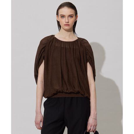 ■デザイン豊かなギャザーで作られたバルーンシルエットのデザインプルオーバーニットです。やや透け感のあるハイゲージの天竺編みを横使いし、衿から肩、裾にかけてギャザーを入れ、空気を孕んだ様な軽さのあるモードなフォルムに仕立てました。裾にはRIB付属を付けメリハリのあるシルエット。肩まわりの優しく包み込む様な量感で気になる二の腕をカバーできるのも嬉しいポイントです。コンパクトなレングスなので量感のあるパンツとのスタイリングもオススメ。着映えすること間違いなしの主役級ニットです。