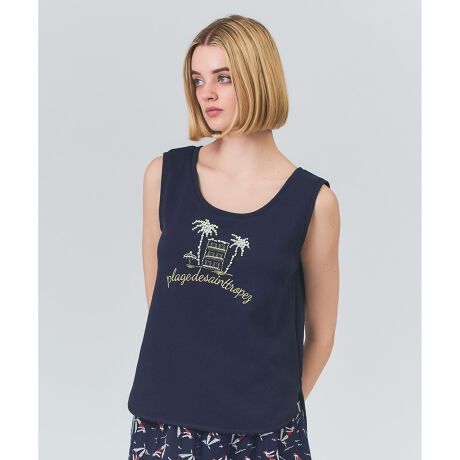 サントロペの海辺をイメージした、夏らしい刺繍が目を惹くノースリーブトップ。 ガラスビジューなどを使った贅沢な手刺繍デザインで、さりげなく煌めく優しいカラーが品よく着映えます。デコルテが綺麗に見えるすっきりと開いた衿ぐりに、ややゆったりとしたシルエット、そしてインでもアウトでもおしゃれに決まる絶妙な着丈に拘った一枚。インパクトのあるボトムスと合わせてメリハリのあるスタイルをお楽しみください。