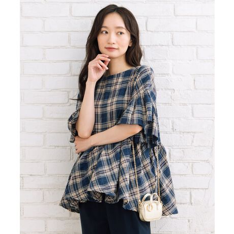 クラシカルなチェック柄を、ボリュームのあるフリル袖とペプラムシルエットは1枚で主役級の存在感。
