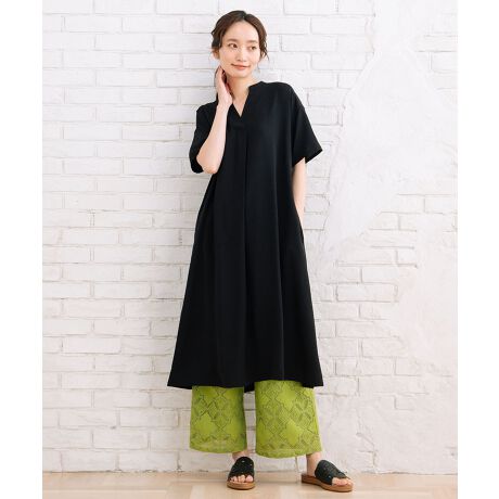 着丈もしっかりあるので、1枚でワンピースとして着るのはもちろん、パンツやスカートとのレイヤードスタイルも楽しんでいただけます。