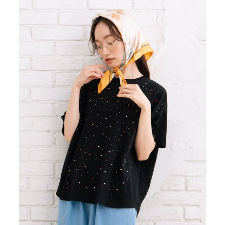フロントには、まるでスプレーで描いたようなランダムなビジューが散りばめられ、カジュアルながらも華やかな印象を与えます。