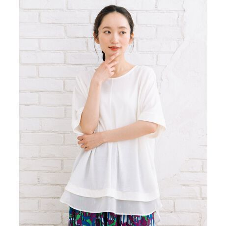 裾のシフォン切り替えが、まるでブラウスを重ね着しているような、一枚で涼しげなレイヤードスタイルが完成する、夏の優秀カットソーです。