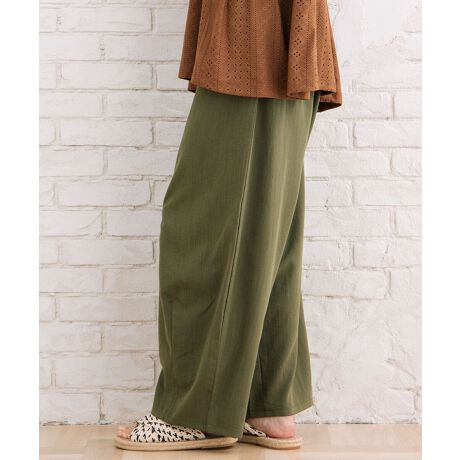 着まわしやすいシンプルなデザインとウエストは後ろゴム仕様で楽な穿き心地。