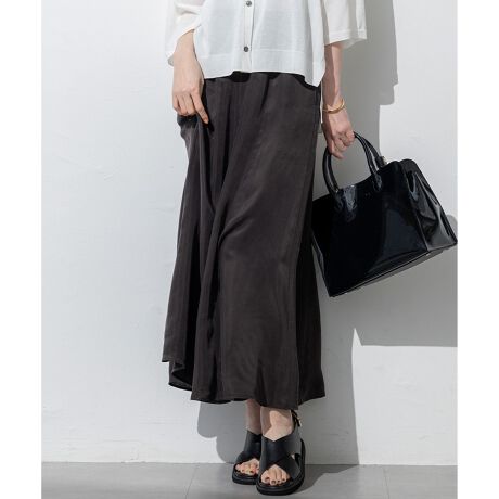 落ち感のある素材で、スッキリとしたラインをつくる上品なギャザースカート