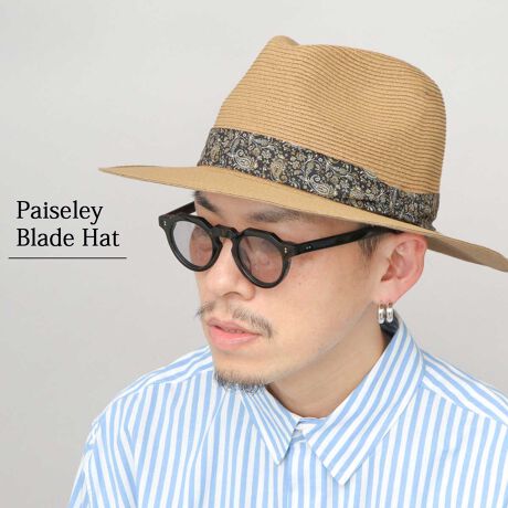 6mm細ブレード フラットミドルブリム ペイズリー帯 ペーパー(麦わら風) 中折れハット